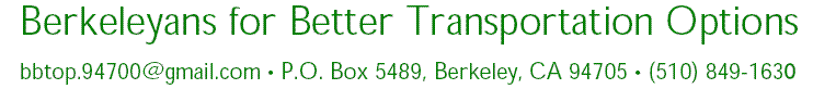 | BBTOP is a handful of citizen and a couple of merchants who share concern about Telegraph Avenue, central downtown, effective transit and use of public funds. BBTOP's efforts to inform citizens about BRT has won it not a single friend in the local bureaucracies which would like to book the $400 million the system is expected to cost. In August, 2008, the Berkeley City Council met in closed session to consider suing BBTOP for the "misconduct" of bringing its initiative to the ballot. |